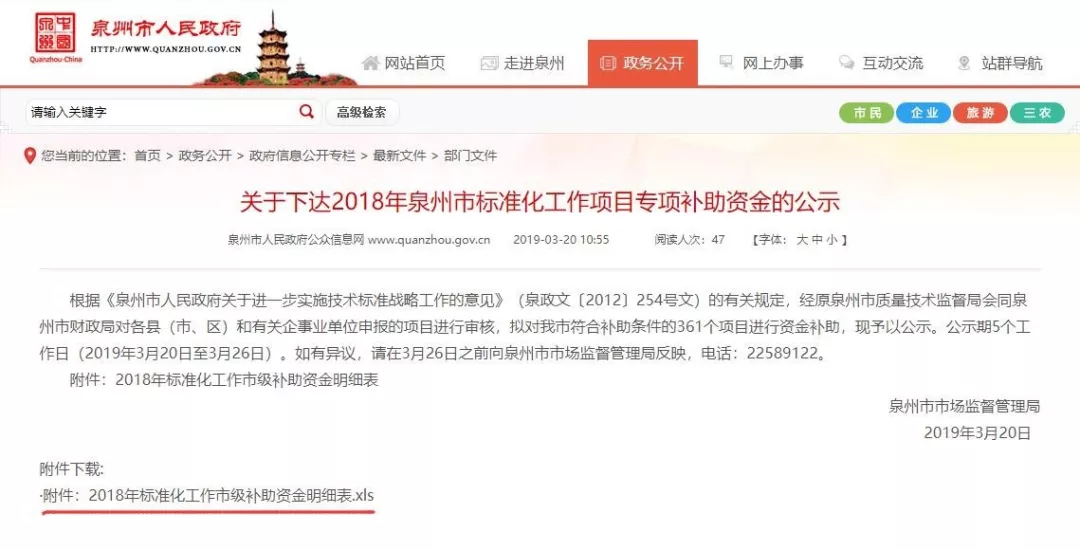 喜訊!我司獲得泉州市2018年標(biāo)準(zhǔn)化工作市級(jí)補(bǔ)助資金