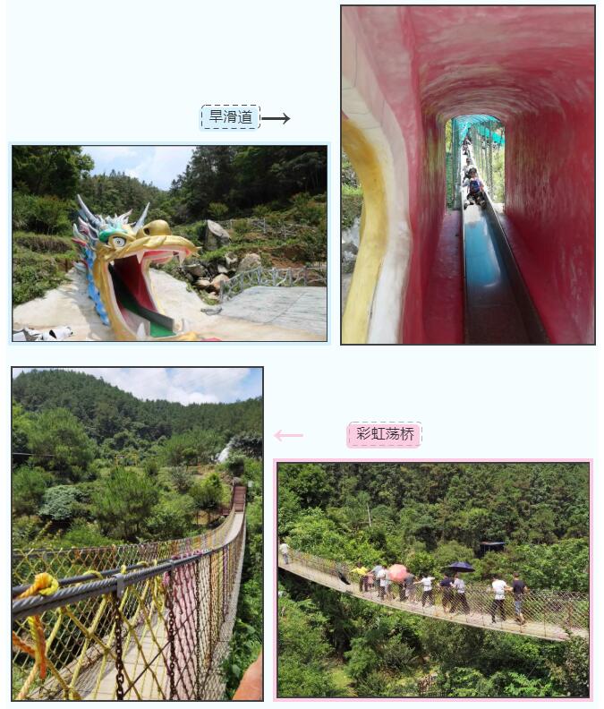 大家坐觀光車到石龍谷大門繼續(xù)體驗景區(qū)的游樂項目:回味小時候坐滑滑梯感覺的旱滑道、美麗的彩虹蕩橋。