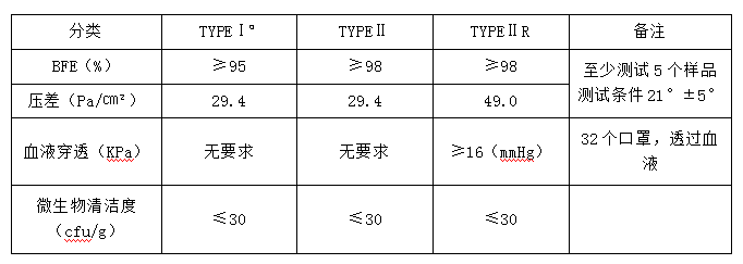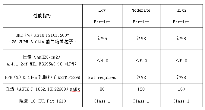 注:a 代表著這種材料只能給病人、易過(guò)敏的人群 該標(biāo)準(zhǔn)的 BFE 測(cè)試流量為 28.3L/min; 壓差測(cè)試流量為 8L/min,試驗(yàn)面積為 4.9cm2。