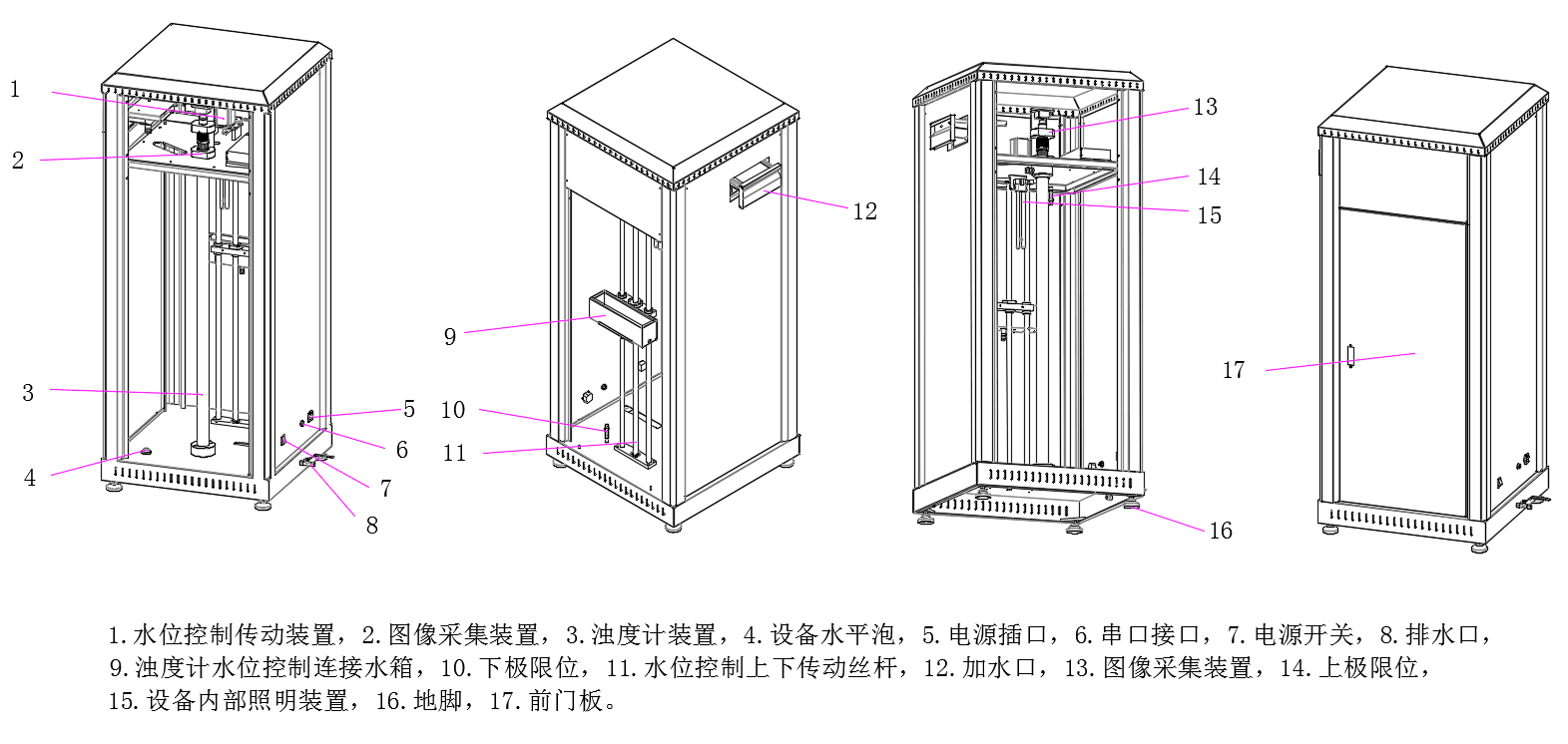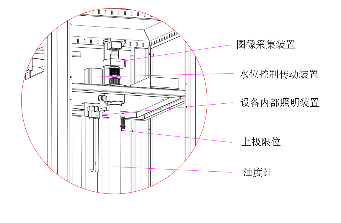 本儀器主要由儀器機(jī)架、水位控制傳動(dòng)裝置、圖像采集裝置、濁度計(jì)裝置、濁度計(jì)水箱、上下極限位、內(nèi)部照明等組成。