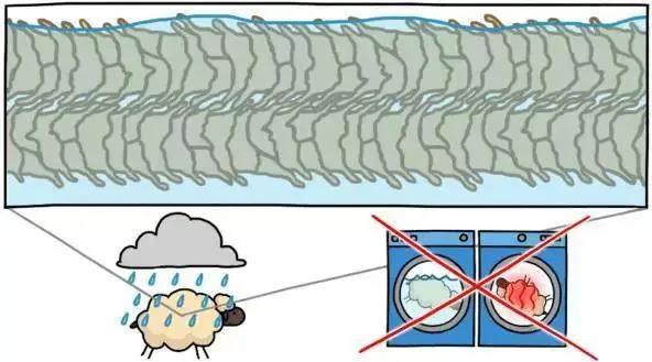 和所有的哺乳動(dòng)物的毛發(fā)一樣,羊毛的外層也被相互重疊、方向一致的毛鱗片包圍著。這些鱗片讓羊毛更容易往單一方向滑動(dòng)。