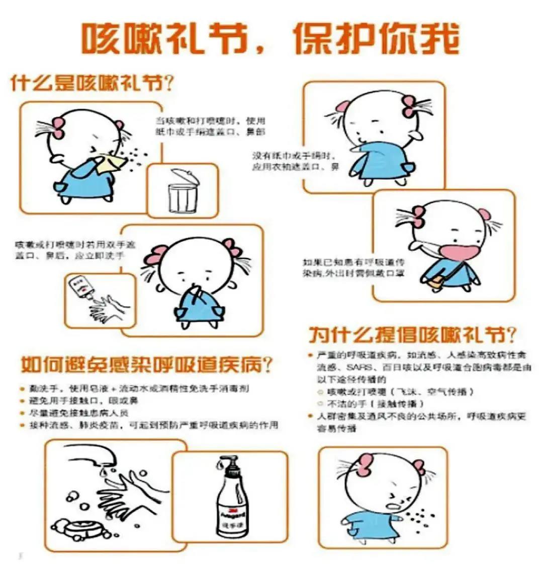 咳嗽打噴嚏時(shí),用紙巾捂住口鼻,無紙巾時(shí)用手肘代替,注意紙巾不要亂丟。